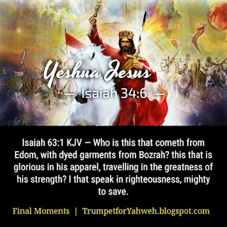 - Isaiah 63:1-8 KJV — Who is this that cometh from Edom, with dyed garments from Bozrah? this that is glorious in his apparel, travelling in the greatness of his strength? I that speak in righteousness, mighty to save. Wherefore art thou red in thine apparel, and thy garments like him that treadeth in the winefat? I have trodden the winepress alone; and of the people there was none with me: for I will tread them in mine anger, and trample them in my fury; and their blood shall be sprinkled upon my garments, and I will stain all my raiment. For the day of vengeance is in mine heart, and the year of my redeemed is come. And I looked, and there was none to help; and I wondered that there was none to uphold: therefore mine own arm brought salvation unto me; and my fury, it upheld me. And I will tread down the people in mine anger, and make them drunk in my fury, and I will bring down their strength to the earth. I will mention the lovingkindnesses of the LORD, and the praises of the LORD, according to all that the LORD hath bestowed on us, and the great goodness toward the house of Israel, which he hath bestowed on them according to his mercies, and according to the multitude of his lovingkindnesses. For he said, Surely they are my people, children that will not lie: so he was their Saviour.